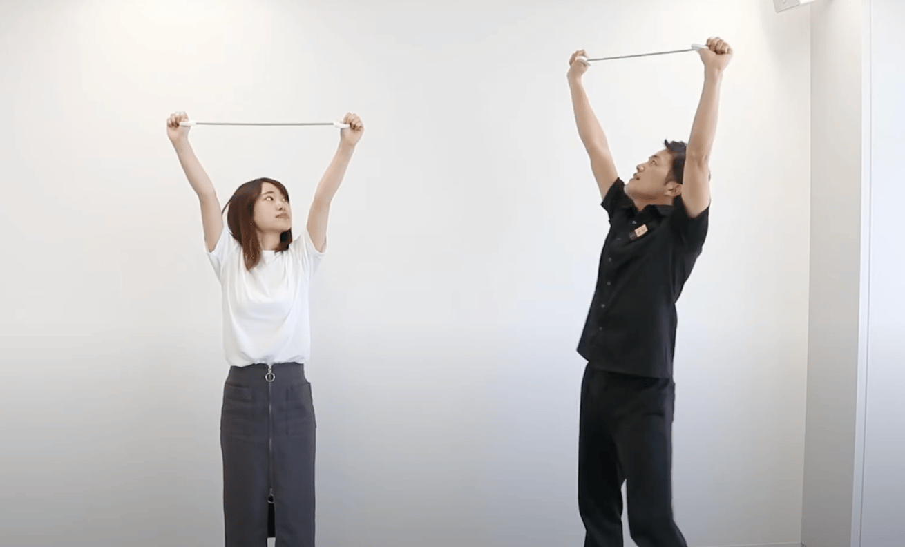 ②両手を上に上げます。※肘は曲げないようにまっすぐに伸ばしましょう。