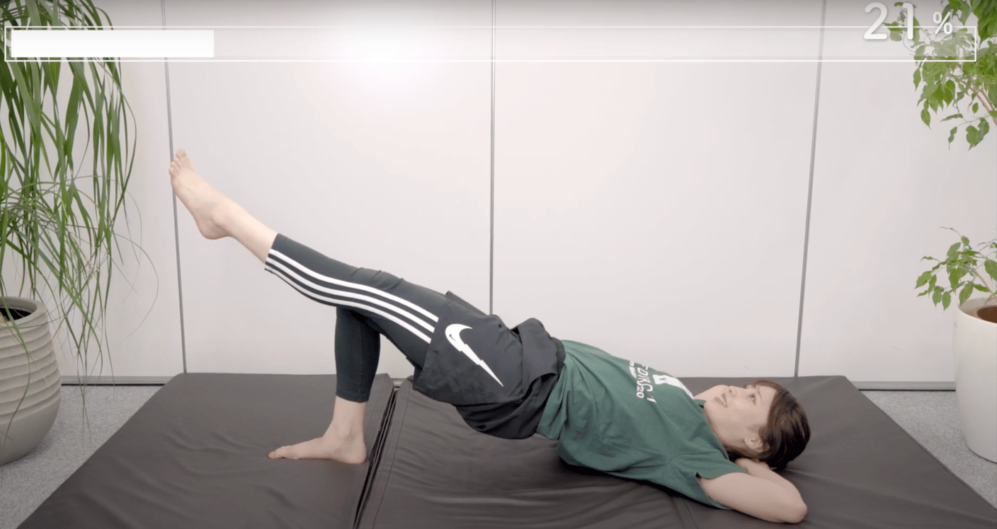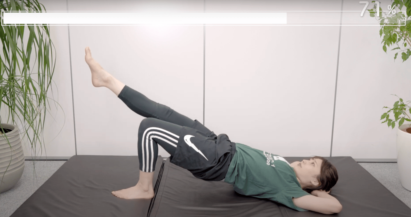右の脚をまっすぐ伸ばし、そのままお尻を浮かせ、ゆっくりと下ろします。30回行いましょう!反対側も同様に行いましょう!(筋肉の使い方に左右でバランスが異なる場合があるので、弱い方は回数を多めに行うことがおすすめです!)