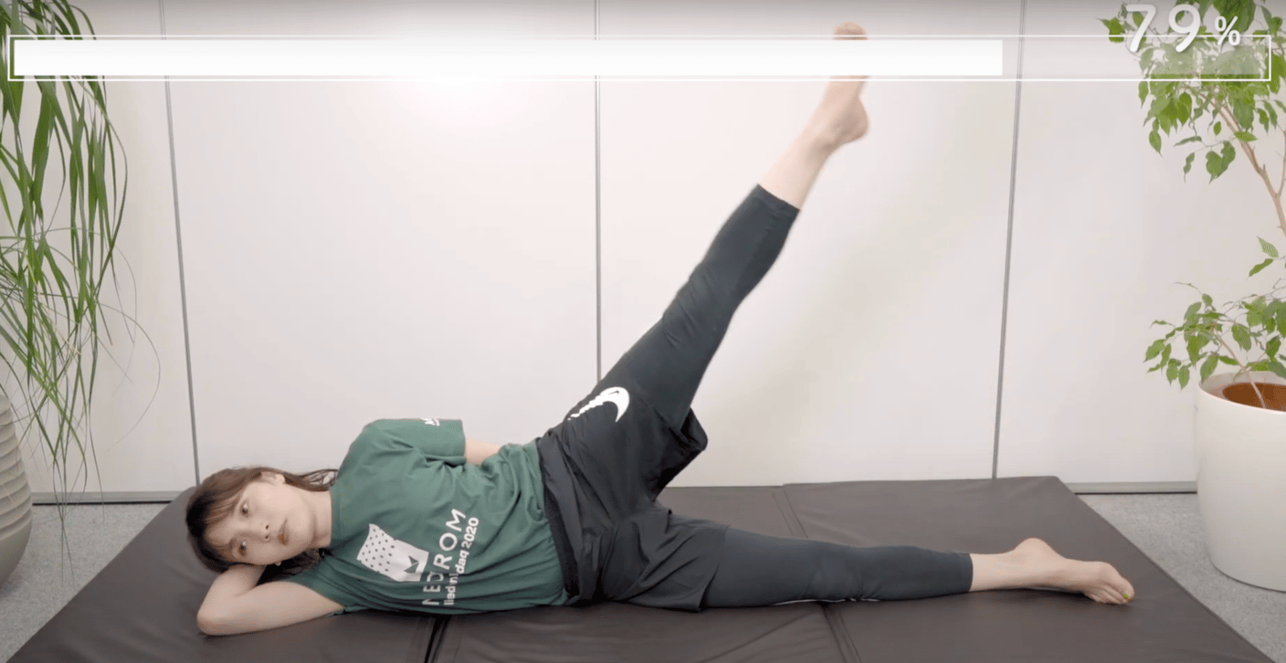 右肩を下にして両足をそろえて横向きになります。左の爪先を天井に近づけるように上にあげ、ゆっくり下ろします。
