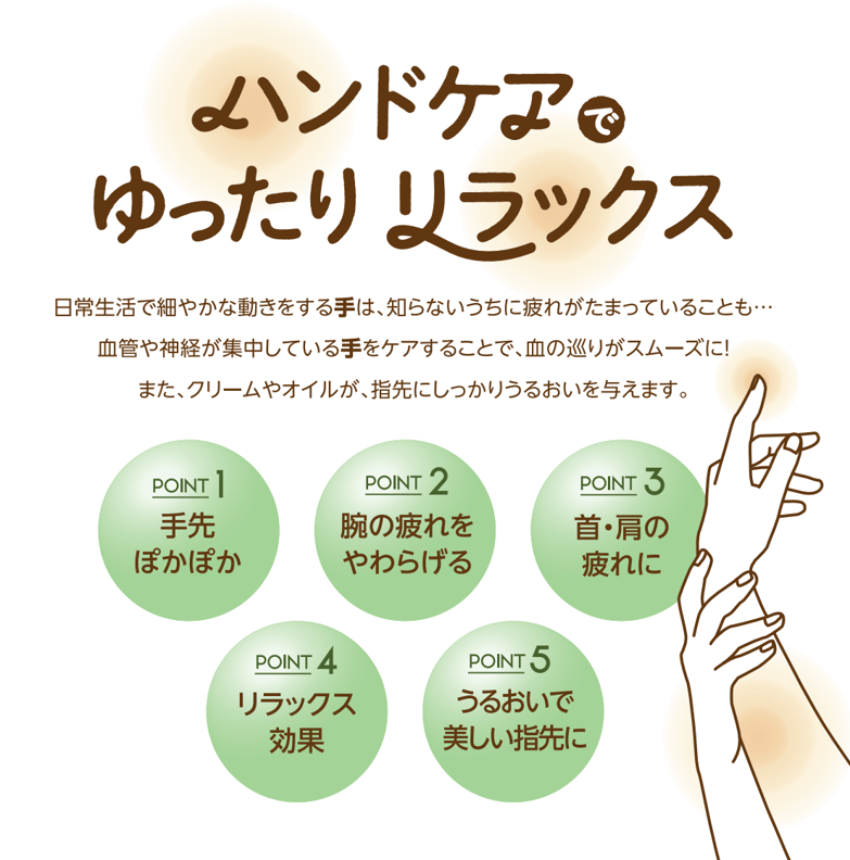 肩こりが慢性的にある方は、もしかしたら腕の筋肉もカチカチになっているかもしれません…。腕をほぐすことによって指先の末端にまで血流が促されるため、冷え性の解消が期待できます。ハンドケアは腕・手のひら・指先をクリームまたはアロマオイルを使ってほぐすので保湿はもちろん、リラックス効果も期待できますよ。