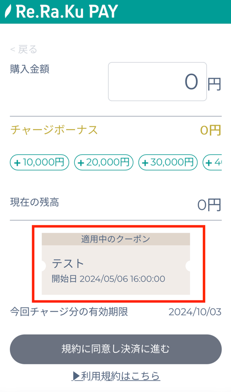 4.チャージ時の画面下方に適応中のクーポンが表示されていることを確認。表示が出ていればそのままチャージ決済へ!