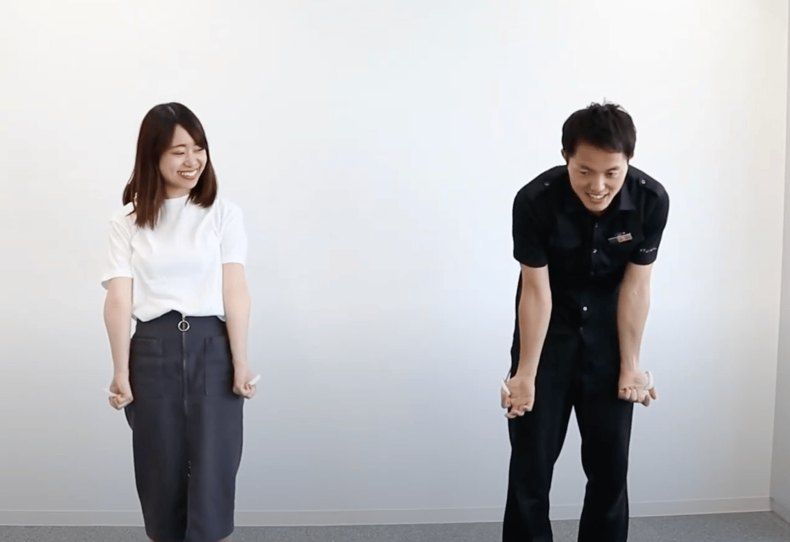 ④腰まで来たらお腹の前まで戻します。上記を1セットして5回行いましょう。