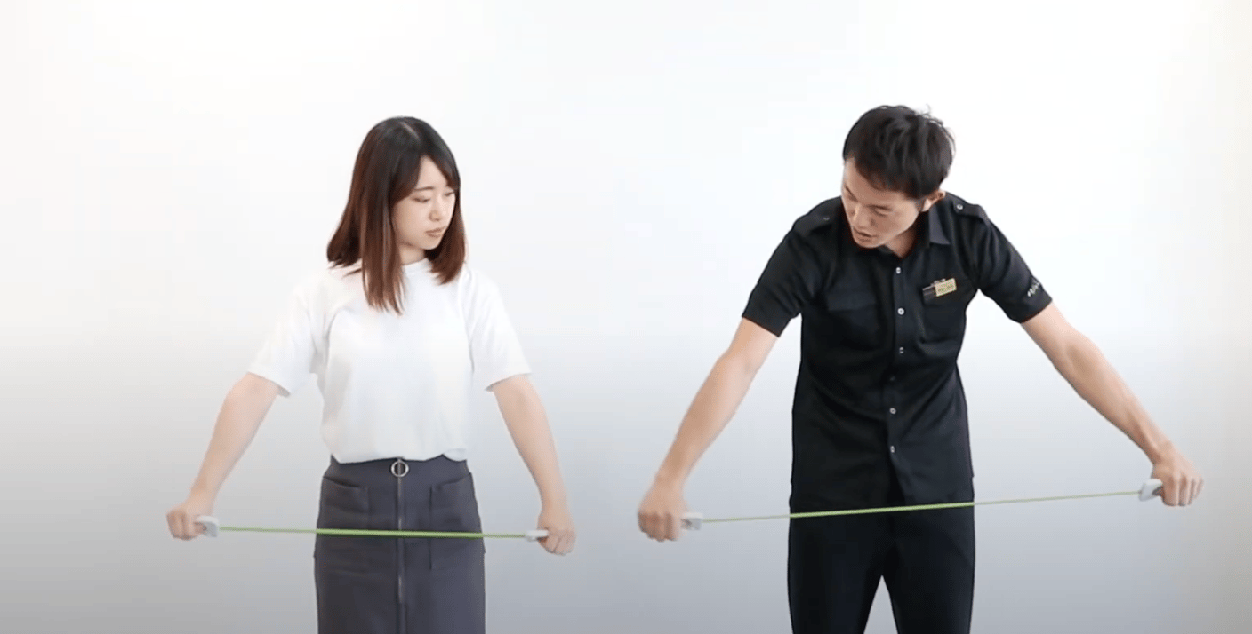 ②両手をお腹の前に持っていきストレッチチューブを横に伸ばします。