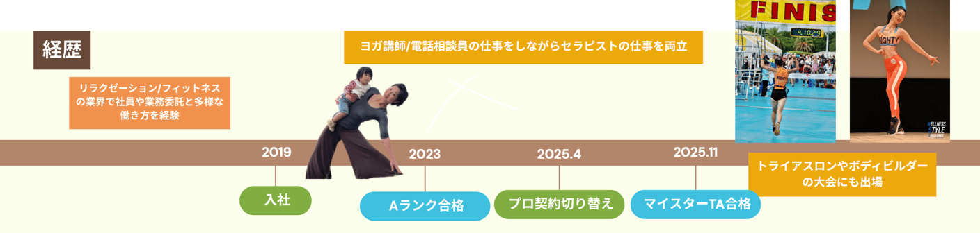 \働き方の自由度 × 技術評価で収入UP!/セラピストでも“業務委託で高収入”を目指せることをご存じですか?Re.Ra.Ku(リラク)で活躍する E.Y さんは、ヨガ講師・電話相談員・子育て・トライアスロン…複数のキャリアや趣味を両立する“マルチワーカー”。そんな E.Y さんが 2025 年に選んだのが、時給制から「業務委託」へのステップアップ。「頑張った分だけ収入に反映される働き方」に魅力を感じたようです♪ E.Yさんの紹介【雇用形態】 業務委託【セラピスト歴】 20年【勤務時間】 週3~4日/1日7時間【経歴】2019年 10月 入社 2023年 7月 Aランク合格2025年 4月 業務委託に切り替え2025年 11月 マイスターTA合格 頑張った分だけしっかり収入に! E.Yさんの1週間の流れ E.Yさんに聞く!業務委託で収入UPした理由とは?技術を活かして働けるから、成果が収入に直結!「自分の技術や指名がそのまま評価に。頑張った分だけ返ってくる働き方に変わりました!」 業務委託契約では、“ 働いた時間 ” ではなく “ 提供した価値(技術) ” が収入に反映されます。技術を磨くほど評価が上がり、収入アップしやすいのが魅力です。働き方の自由度が高く、他の仕事・育児とも両立しやすい「シフト調整がしやすくなって、ヨガ講師や電話相談の仕事、育児とも無理なく両立できています。」 業務委託は出勤の柔軟性が高いため、子どもの行事や他の仕事と時間を調整しやすいのが特長です。・ヨガ講師・電話相談の仕事・トライアスロンの練習・育児など、複数の役割を無理なく両立しています!安心して成長できる理由は“統一された技術と教育制度”「技術と接客が統一されていて、誰でも安心して成長できる環境です。」 Re.Ra.Ku では技術・接客が体系化されているため、未経験でもブランクがあっても安心してスキルを習得できます。さらに社内ではランク制度があり、自分の頑張りが明確に可視化されます!指導者としてのキャリアも!「マイスターTA」合格で視野が広がった2025年11月にマイスターTA(技術指導者)に合格しました!!!技術を “ 教える側 ” になったことで、自信とやりがいが大きくなりました。キャリアアップの幅が広いのも、Re.Ra.Ku の働きやすさの特徴です♪ セラピスト積極採用中! あなたも “ 技術を武器にする働き方 ” を始めませんか?・今より収入を伸ばしたい・技術で評価されたい・自分のライフスタイルに合わせて働きたい・育児や別の仕事と両立したいそんな方に「業務委託セラピスト」はぴったりです。まずはお気軽に「応募→面接予約」をし、働き方をご相談ください♪あなたの “ 理想の働き方 ” を一緒に見つけましょう! Re.Ra.Kuグループでは、現在セラピストを積極的に募集しています!未経験からでも安心の研修制度、成果がそのまま収入に反映されるインセンティブ制度、そして自由度の高い働き方。あなたのライフスタイルに合わせて、やりがいも収入も両立できるセラピストを目指しませんか?まずは簡単1分応募!ご応募お待ちしています♪