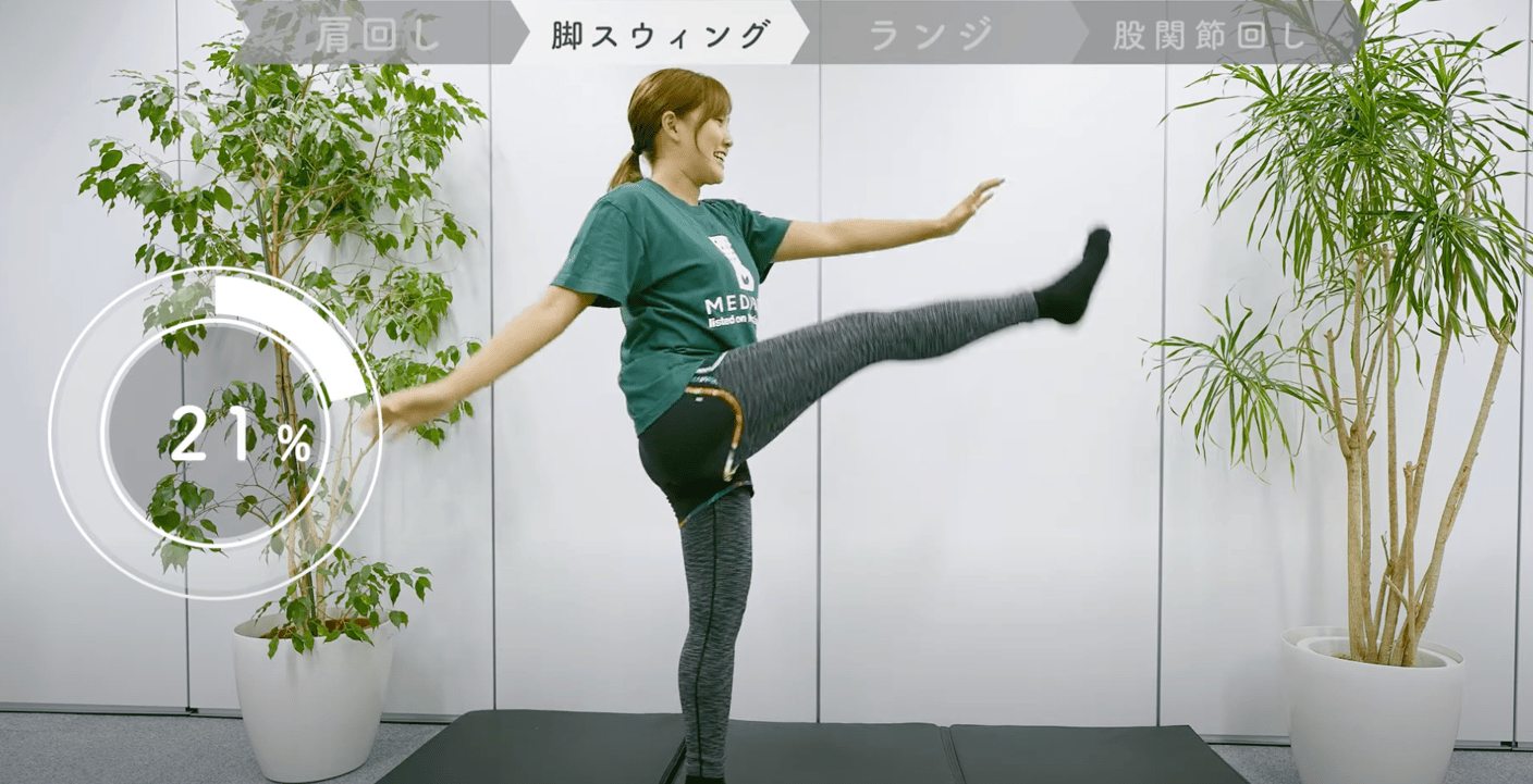 立った状態で右の脚を上げ左手でつま先をタッチ、左の脚を上げ右手でつま先をタッチを繰り返していきます。