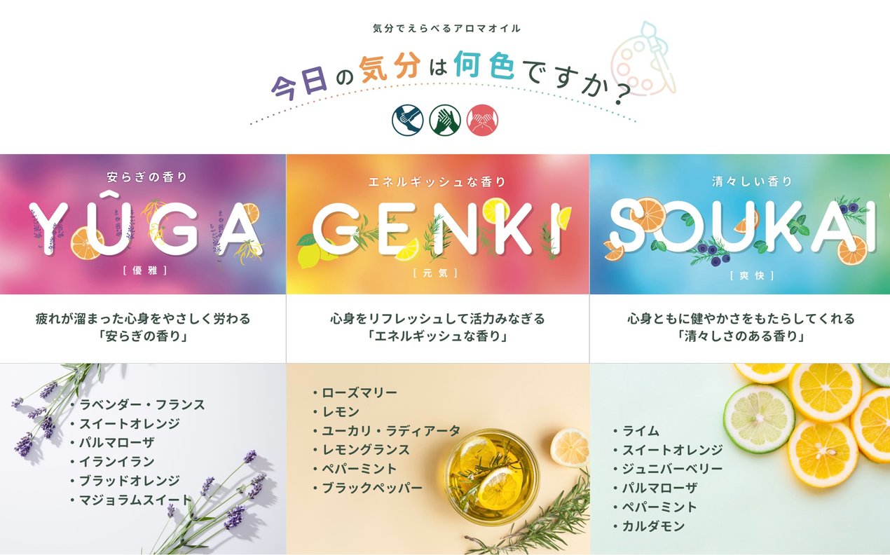 アロマテラピーの観点から香りのテーマごとに調香された3種類のオイルを、その日の気分によってお選びいただけます。