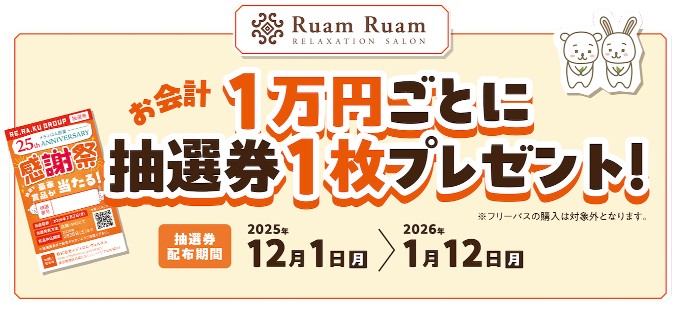 Re.Ra.Ku グループ(Re.Ra.Ku/Bell Epoc/Spa Re.Ra.Ku/Ruam Ruam/Re.Ra.Ku PRO)の各店舗で抽選券をGET!