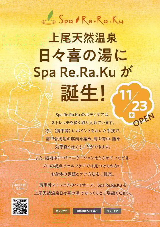 Spa Re.Ra.Ku はRe.Ra.Ku がプロデュースを行い、温浴施設に展開するリラクゼーションスタジオです。入浴後に、身体のケアを行うことで普段より高いリラクゼーション効果が期待できます。