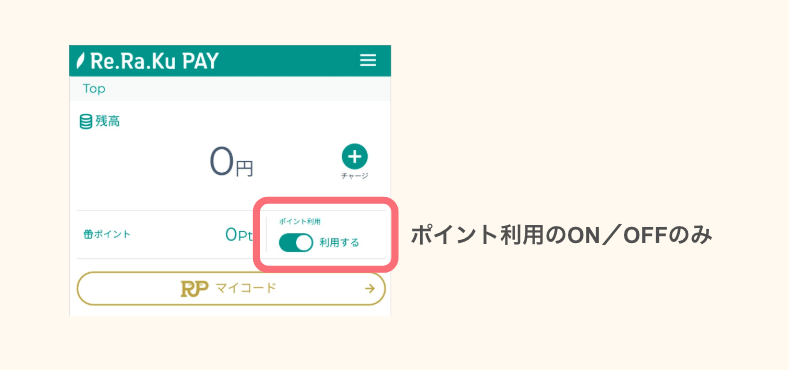 Re.Ra.Ku PAY マイページ残高下部にある「ポイント利用」のON/OFFボタンですが、