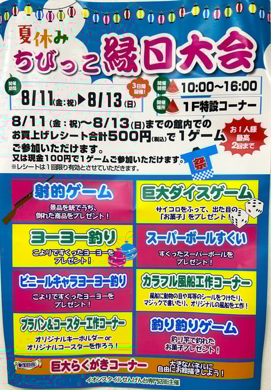 明日8/11(金・祝)~13日(日)の期間限定で『夏休み ちびっこ 縁日大会』を開催致します!!(パチパチ~)