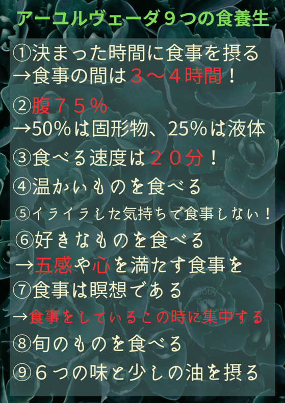 最後にアーユルヴェーダの9つの食養生をご紹介します。