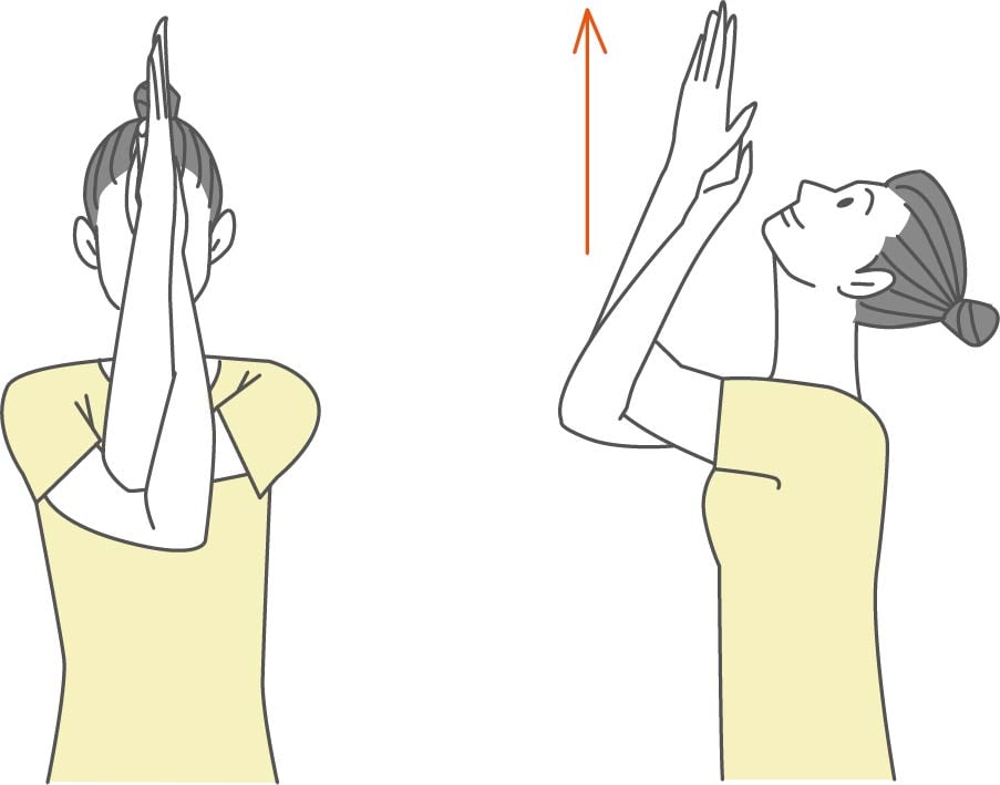 ①深呼吸をしながら、胸の筋肉を伸ばして肩や腕を回旋させましょう。