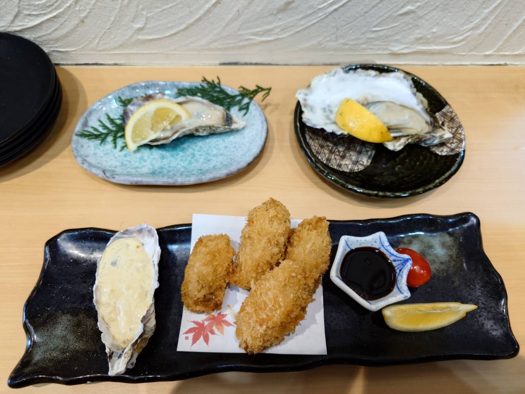 せっかくなので生牡蠣、焼き牡蠣、牡蠣フライの3点セットをいただきました。