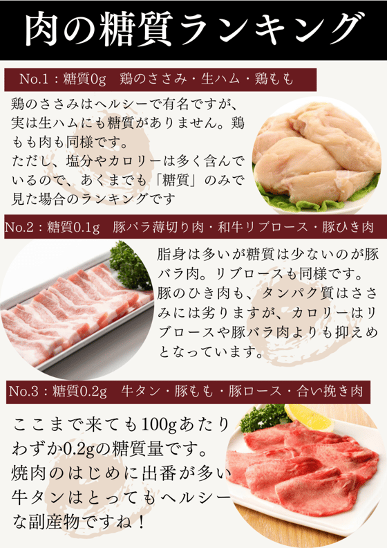 肉はカロリーが高いからと気にする人も多いですが、糖質制限においてはカロリーはそこまで重要ではありません。あくまでも含有されている糖質量に注目を置くのが糖質制限ダイエットとなっています。
