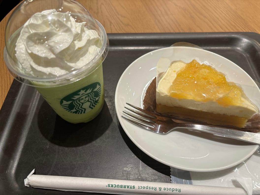 スターバックスのメロンフラペチーノと、オレンジケーキを食べました。