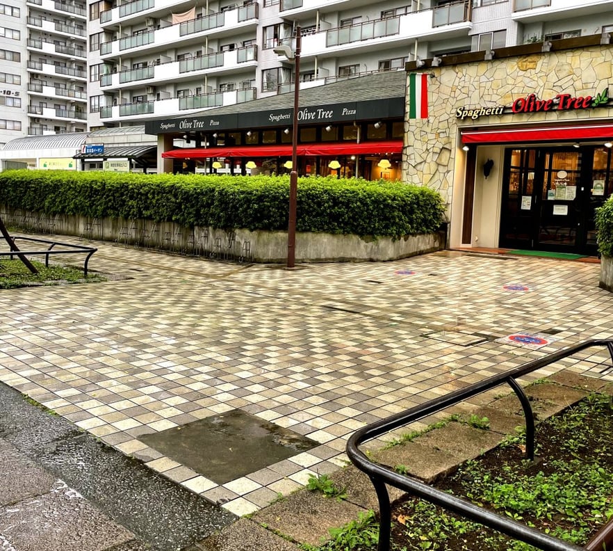②公園通りを200mほど進むと、右側に大戸屋さん、オリーブの木さんが見えてきます。