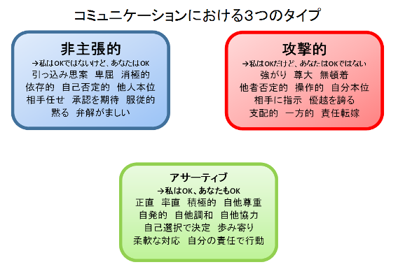 アサーティブトレーニングでは、まず対人コミュニケーションのタイプを知ることから始めます。以下の表の中から、それぞれのタイプはどのような雰囲気なのかをぼんやりでいいので把握して下さい。