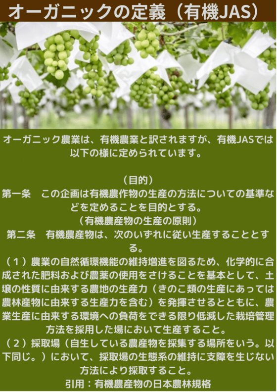 規定の中では他にも「自然循環機能の維持増進」「環境への負荷軽減」「生態系の維持」など、オーガニック・有機農業の本来の目的が規定の中で謳われています。また、条文はこの後も続き、第一条、第二条を満たすために何を使用すべき・使用してはならないということが記載されており、一般の農業と、有機農業の区分を明確にされていることが分かります。