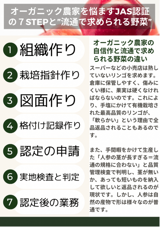 その背景には、「有機JAS認定に多大な時間とお金がかかること」と、消費者と農家を繋ぐ流通の過程で求められる「流通の規格」が関係しています。