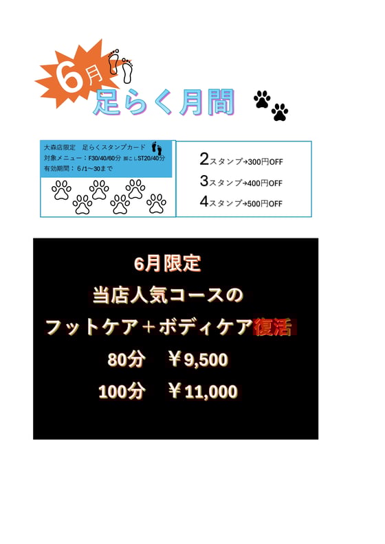 6月は梅雨の季節という事で、当店では足ラクイベントを実施中!大人気のボディケアとフットケアのセットコースをお得にほぐせたり、足元に関するコースを施術するとスタンプがもらえて、それを貯めると施術割引ができます!