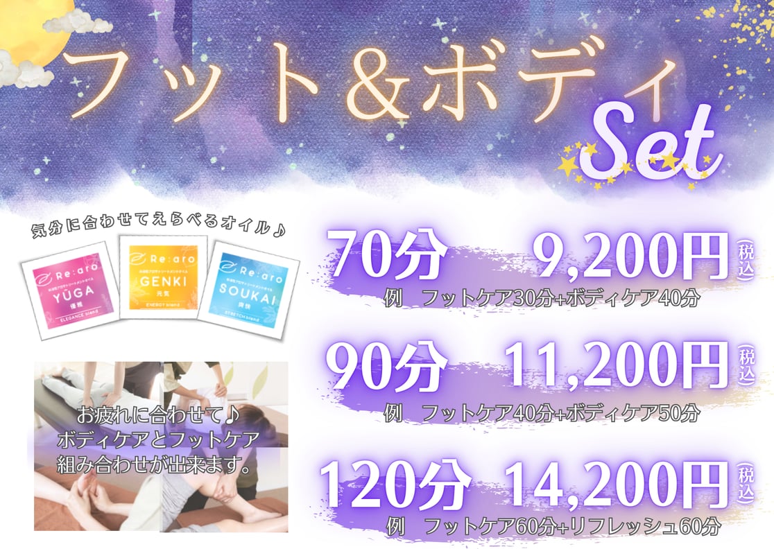 こんにちは! 9月になりましたがまだまだ暑いですね。夏バテという言葉は世間に深く浸透していますが、「秋バテ」というものもあるそうです。 今は暑いのでイメージや対策がしづらいですが、少しずつ気温は下がっていくので寒暖差による倦怠感や体調不良を感じるのが秋バテだそうです。 9月からはなるべく湯船に浸かって、エアコンで冷やしがちだった身体全体を休ませてみましょう! さて、アリオ亀有店では9月からフット&ボディケアセットコースの提供を開始します! この他にも頭周りや手周りなどいろんなメニューを用意してお待ちしております。旅行やお盆明けでたまったお疲れはリラクにおまかせください!!