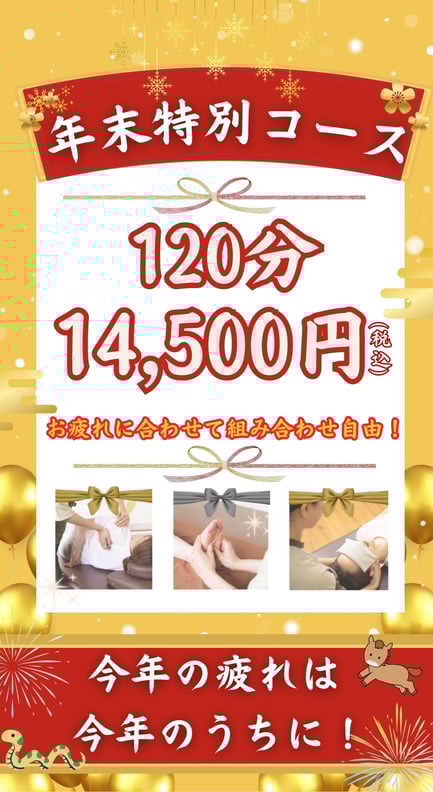 今年もあとわずかとなり、師走のソワソワした空気になってきましたね、、、イルミネーションやクリスマスツリーなど楽しい行事も目白押しです! いつもお仕事お疲れ様です。仕事納めに向けて皆さんラストスパートで頑張りすぎてないでしょうか?健康管理も重要になってきます。身体が疲れてはあとひと踏ん張りがききません。一日の終わりに湯船に浸かって是非自分を労わってくださいね。 亀有店でもそんな頑張っている皆さんに向けた企画を色々と準備しています!今年の疲れは今年のうちに!をスローガンにまずは15日から始まる「年末特別コース120分」お疲れに合わせて自由に組み合わせができて、サポート価格にて提供します! 年末年始も休まず営業しております!皆様のご来店スタッフ一同心よりお待ちしております。