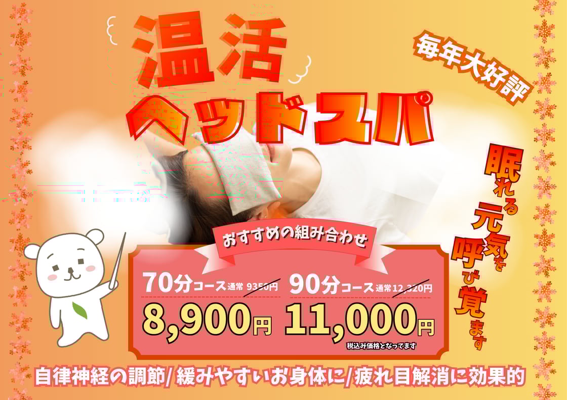 今年も12月になってしまいました。1年は本当に早いですね。 11月からですが、インフルエンザや、乾燥、気温の低下から来る風邪など、、、 特に今年は、引いた風邪の治りが悪いとよく聞きます。鼻や、咳が残ってなかなか抜けないと聞きます。皆様気を付けて過ごしましょう、 〇しっかり身体の疲れをとる事〇睡眠をしっかり確保する事〇バランスの良い食事に気をつける事〇適度に運動をして血行を促進し、体調を整える。〇乾燥対策(お部屋の加湿など)12月の亀有店の一押しコースじは11月人気だったボディケア+ホットヘッドスパの組み合わせです。是非試してください!ホットピローも気持ちいですよ~♪