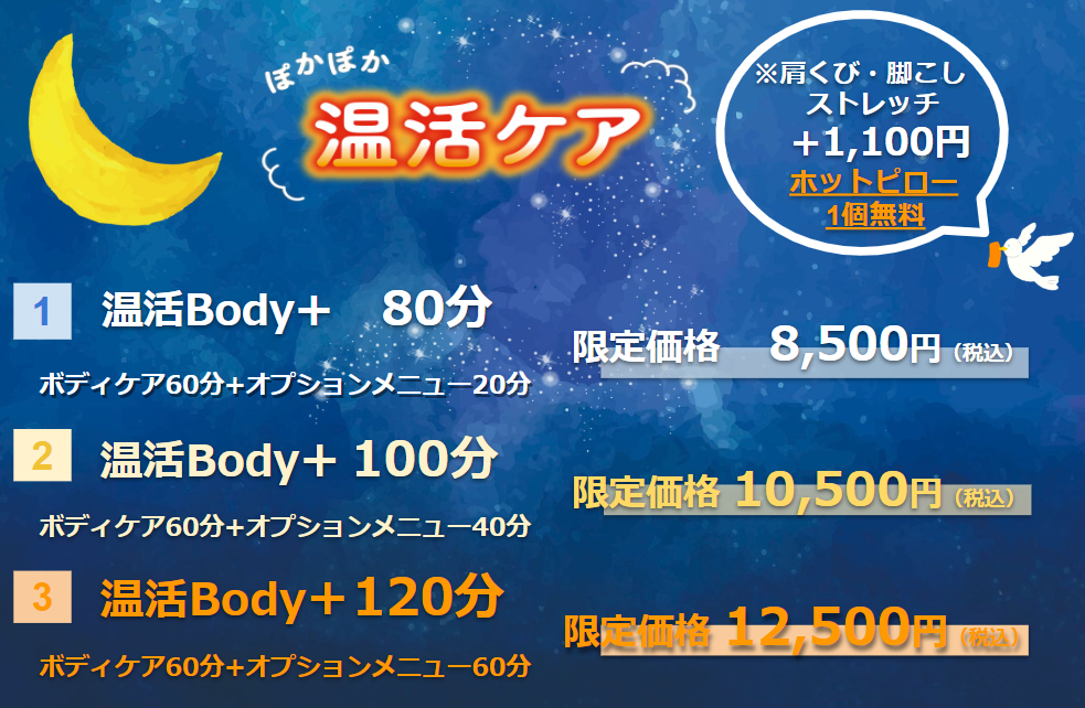 温活Body+120分で当日のお身体の状態によりご提案させていただきます。