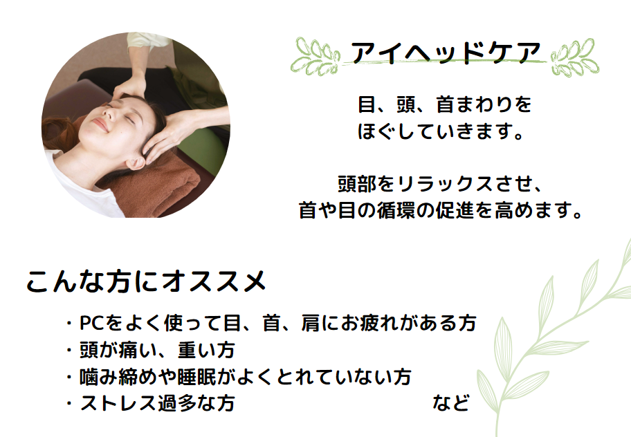 朝晩冷え込む時もありますがまだ暑くて困りますね。でも平均気温的には去年とさほど変わらない様ですので毎年記憶があいまいな感じでとほほ。 さて、前回好評でした首に直接美容ジェルを塗ってリンパを流す【ネックリンパ】がセットのコースが復活しました。ゴリゴリ溜まった老廃物をぶちぶち潰す感覚が気持ち良いですよ~ 同時にホットアイヘッドケアもスタートしています。10分単位でアイヘッドケアができるのであまり時間に余裕が無い方にもオススメです。 秋の夜長に夏にため込んだお疲れをじっくりほぐしましょう。