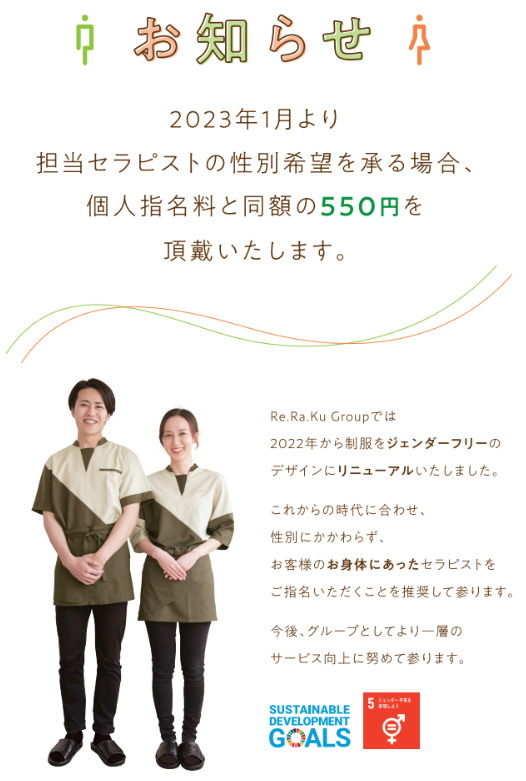 また、スタッフの女性希望・男性希望の場合も個人指名料と同額の550円を頂戴する事となりました。