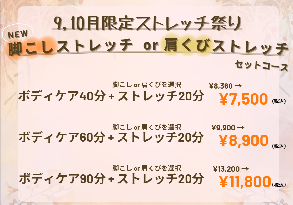 こんにちは!ここ数日、曇りの日が多いのもありますが朝晩過ごしやすくなってきていて私の季節がきた~~~!!!となってます!それくらい四季の中で、秋がとっても好きなクドウです(^^) とはいえ9月は、季節の変わり目でもあり体調が崩しやすい時期でもあります。俗に言う「秋バテ」というもの。だるさや食欲不振などは、集中力の低下につながってしまいます。 その重だるさ、そのままにせず疲れる前の身体のケアをぜひ今のうちから習慣の一つにして、秋から冬にかけての健康維持をして行きましょう! 今月も残すところ1週間と少し!大好評!爽快ヘッドスパセットコースも今月末で終了です! みなさんのお越しを心よりお待ちしております♪