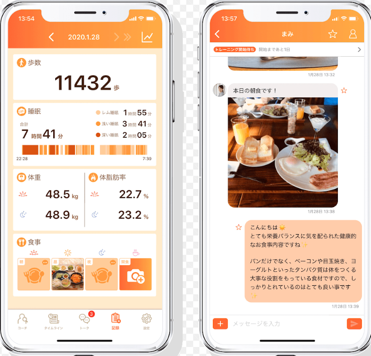 日々の食生活、運動、睡眠、代謝、身体や心の疑問点など気になる事をメッセージを通して聞くことができます。