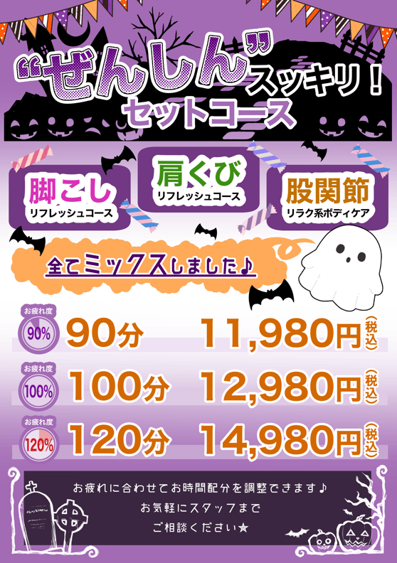 皆様、こんにちは(#^.^#)Re.Ra.Ku EQUiA 北千住店です。早いもので、もう10月ですね♪10月は季節の変わり目で体調を崩しやすい季節です。気温の変化に対応できるように空調管理や体温調節にお気をつけ下さい(#^.^#)十分な睡眠と適度な運動も秋バテ予防に効果的です(^^)v10月の北千住店のおすすめコースは『全身ミックスコース』肩くびリフレッシュ 脚こしリフレッシュ ルーツストレッチ(股関節周辺)すべてが加わって全身をほぐしていきます(/・ω・)/★90分 11,980円★100分 12,980円★120分 14,980円全身を、くまなく解してスッキリしませんか!(^^)!、秋バテ予防にもおススメです♪ 北千住店は駅構内にあり、お仕事帰りの夕方から夜はご予約が早い時間に埋まってしまうことが多いです(。-人-。) 当日の朝や昼間にオンライン予約状況を確認し、行きたい時間帯に空きがないという場合でも、お助けスタッフ達が追加され予約に空きが出ることもございますので、こまめに色んな時間帯に予約状況をチェックしてみてください!(^^)!