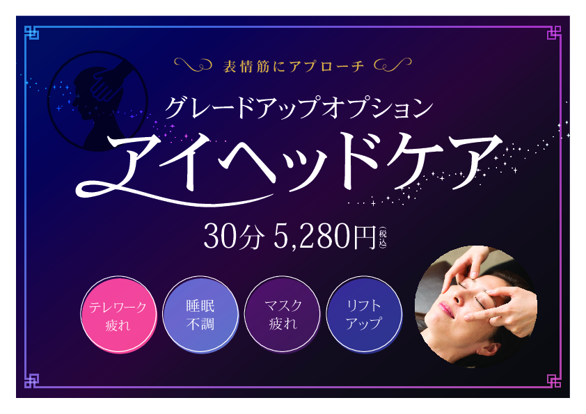 また、気圧が下がってめまいや頭重が出る方もいらっしゃるかと思います。首のお疲れと合わせて、オススメなメニューにグレードアップアイヘッドケアがございます。