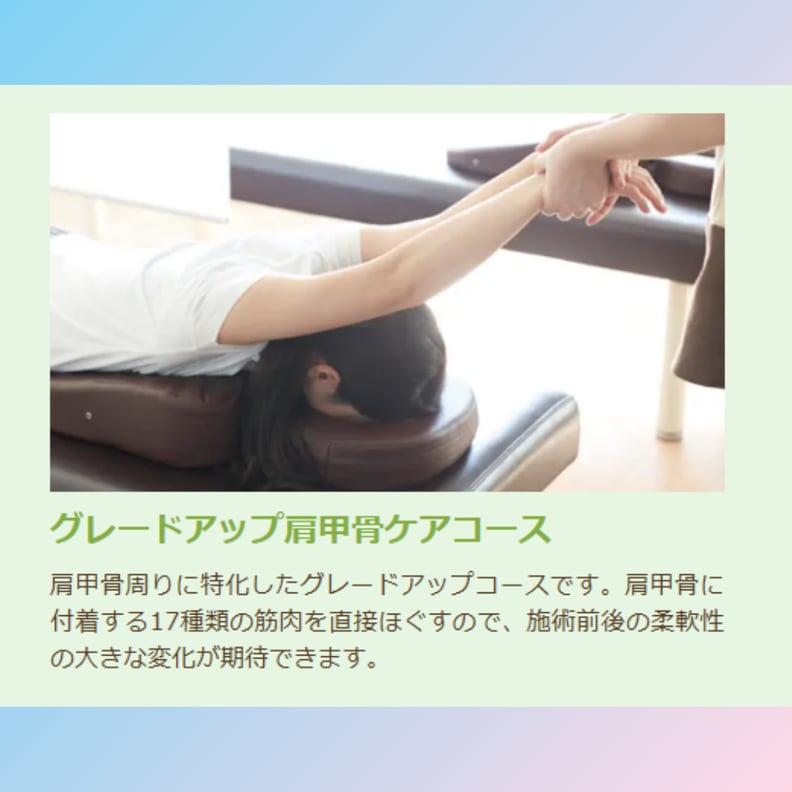 肩甲骨に付着する17種類の筋肉を細かく捉え伸ばしていき、施術前後の柔軟性の大きな変化が期待できます。