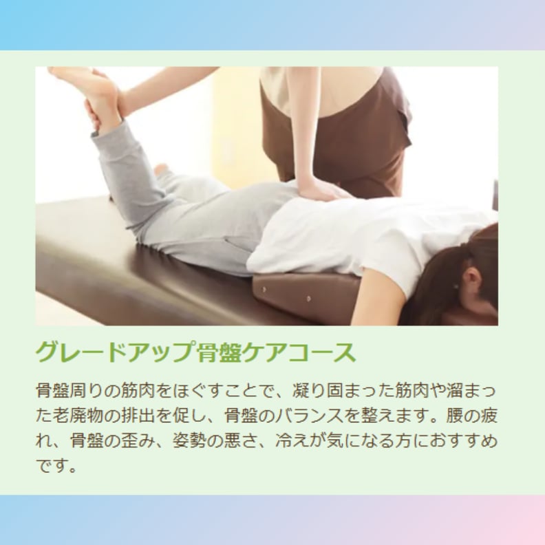 リラク系ボディケアにプラスして股関節から下半身全体をストレッチし、アプローチをかけていきます。