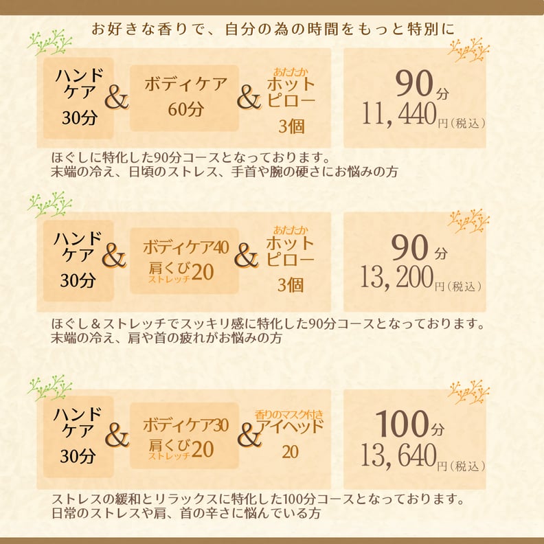 元住吉店では、保湿成分たっぷりのアロマクリームを使用してほぐしだけでなく、保湿と癒される香りで日々の疲労の緩和にアプローチ!