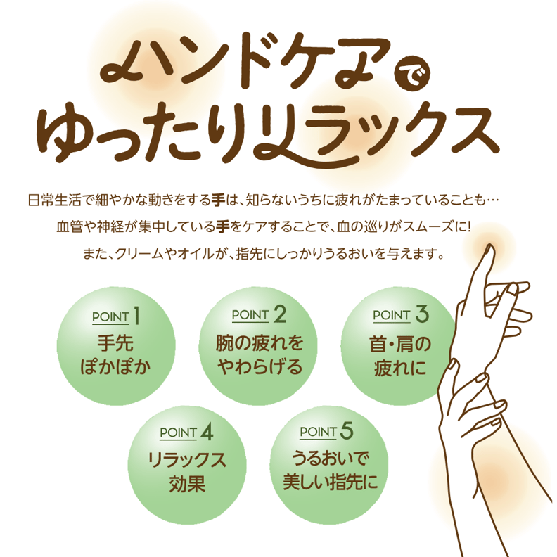 ひじから指先をクリームまたはアロマオイルで流していくケアです。
