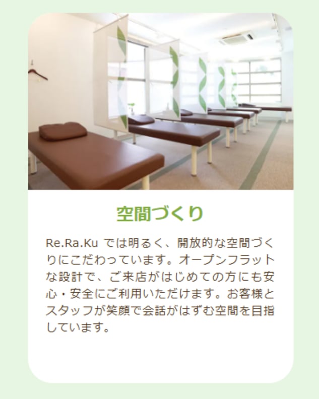 こんにちはRe.Ra.Ku元住吉店の星野です☆ 今日はRe.Ra.Kuの魅力を紹介させていただきます!1.自分では伸ばせない部分までしっかり伸ばせる2.疲れにくい体づくりにつながる3.姿勢改善が期待できる4.もみほぐしよりすっきり感が長持ちしやすい5.日常で使えるセルフケアを教えてもらえるどんな方におすすめか?・慢性的なコリや疲れを感じている方・デスクワーク中心の生活の方・マッサージでは物足りなさを感じている方こんな方に特に向いています。身体の根本から整えたい方は、ぜひ一度試してみてはいかがでしょうか!本日は14時10分~ご案内可能です◎皆様のご来店を心よりお待ちしております!================Re.Ra.Ku元住吉店☆日吉・武蔵小杉・菊名エリアで大人気のリラクゼーションスタジオ☆マッサージよりも気持ちいい!話題のオリジナル「肩甲骨ストレッチ」で健康のための“予防”のボディケア始めませんか?【アクセス】最寄駅 東急東横線 東急目黒線 元住吉駅武蔵小杉駅からもアクセスしやすい!【場所】元住吉駅 改札出て、ブレーメン通りから徒歩3分!お気軽にご来店ください♪近くにコインパーキングあります。【ご予約】☆店舗ページよりネット予約☆TEL:044-948-5510================