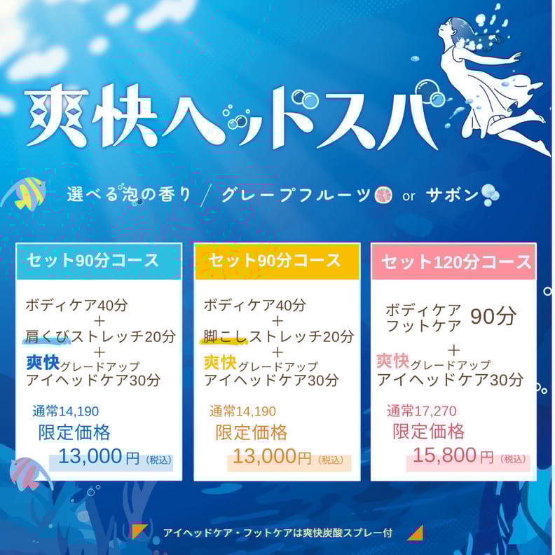 70分からお二人以上のご予約で時間内で、お疲れに合わせたカスタムコースOK!