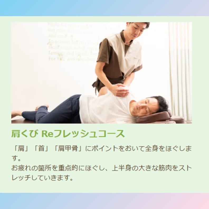 こんにちは!! Re.Ra.Ku元住吉店の臼井です☆【本日13時30分~22時00分迄、ご案内可能でございます◎】☎:044-948-5510WEB:https://reraku.jp/studio/motosumiyoshi/booking ◆リフレッシュコース(肩くび)コースのご紹介今回は Re.Ra.Ku で提供しているメインコース「リフレッシュコース」をご紹介!【肩くび リフレッシュコース】リラク系ボディケアに肩と首に特化したリラク独自のストレッチが加わります!ぐぅーんと伸びて気持ちいい、肩と首に特化したRe.Ra.Ku独自のストレッチコースです。デスクワークで肩の疲れが慢性的にある方にオススメです。「肩」「首」「肩甲骨」にポイントをおいて全身をほぐし、上半身の大きな筋肉をストレッチしていきます。上半身のお疲れ箇所を中心に肩甲骨、肩、首周辺からストレッチを加え、体勢を変えながら全身をほぐします。 ◆コースごとの特徴◇60分コース短時間でほぐしたい方、隙間時間でもしっかり伸ばしたい方におすすめです。上半身がお疲れの方には、肩甲骨、肩、首周辺へストレッチを加えながらほぐします。Re.Ra.Ku オリジナルの肩甲骨ケアを取り入れ、もみほぐしと肩まわりのストレッチを組み合わせることで、「肩」「首」「肩甲骨」の軽さや動きやすさを実感できます。◇90分コースうつ伏せ・横向き・仰向けの体勢で行うコース。上半身がお疲れの方には、肩甲骨、肩、首周辺からストレッチを加え、体勢を変えながら全身をほぐします。全身のもみほぐしと肩くびストレッチを組み合わせることで、全身の疲労やだるさの解消へ導きます。◇120分コースうつ伏せ・横向き・仰向け体勢で行う120分のしっかり本格コース。上半身がお疲れの方には、肩甲骨、肩、首周辺から、全身をくまなくストレッチしながらほぐします。 Re.Ra.Ku オリジナルの肩甲骨はがしに、お疲れの箇所に合わせたもみほぐしと肩くびストレッチを組み合わせ、じっくりと筋肉の深層部までほぐします。より広い範囲のアプローチ、スッキリ感、また施術の効果を長持ちさせたいという方におすすめです。 当店のリラク系ボディケアとストレッチが融合したリフレッシュコースをご体感ください!お電話でもご予約・お問い合わせOK!045-948-5510お客様のお疲れに合わせたケアをご用意して、スタッフ一同お待ちしております!本日もお待ちしております(^^♪