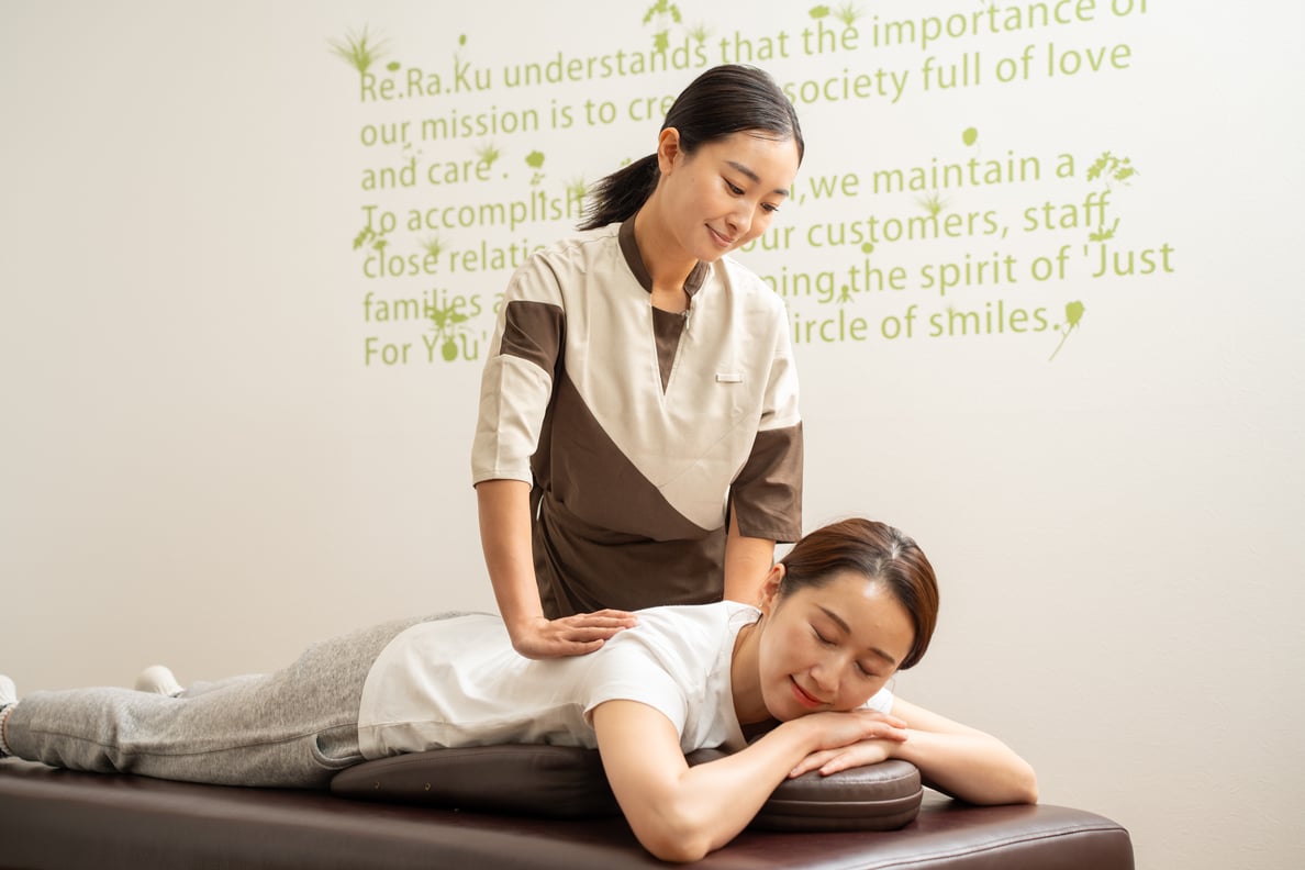 Re.Ra.Ku オリジナルの肩甲骨はがしに、全身のもみほぐしとストレッチを組み合わせることで、全身の疲労やだるさの解消へ導きます。