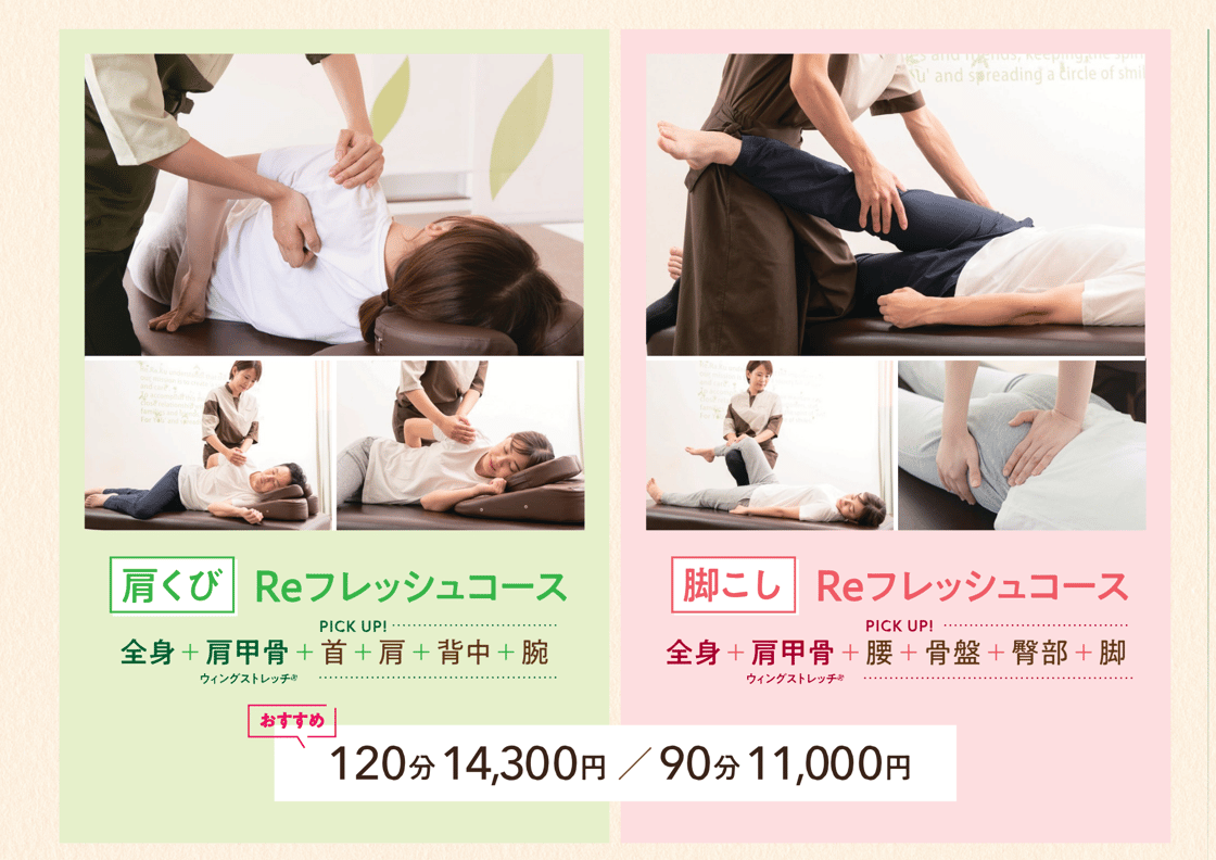 こんにちは!! Re.Ra.Ku元住吉店の臼井です☆【本日13時30分~22時00分迄、ご案内可能でございます◎】☎:044-948-5510WEB:https://reraku.jp/studio/motosumiyoshi/booking ◆リフレッシュコース(肩くび)コースのご紹介今回は Re.Ra.Ku で提供しているメインコース「リフレッシュコース」をご紹介!【肩くび リフレッシュコース】リラク系ボディケアに肩と首に特化したリラク独自のストレッチが加わります!ぐぅーんと伸びて気持ちいい、肩と首に特化したRe.Ra.Ku独自のストレッチコースです。デスクワークで肩の疲れが慢性的にある方にオススメです。「肩」「首」「肩甲骨」にポイントをおいて全身をほぐし、上半身の大きな筋肉をストレッチしていきます。上半身のお疲れ箇所を中心に肩甲骨、肩、首周辺からストレッチを加え、体勢を変えながら全身をほぐします。 ◆コースごとの特徴◇60分コース短時間でほぐしたい方、隙間時間でもしっかり伸ばしたい方におすすめです。上半身がお疲れの方には、肩甲骨、肩、首周辺へストレッチを加えながらほぐします。Re.Ra.Ku オリジナルの肩甲骨ケアを取り入れ、もみほぐしと肩まわりのストレッチを組み合わせることで、「肩」「首」「肩甲骨」の軽さや動きやすさを実感できます。◇90分コースうつ伏せ・横向き・仰向けの体勢で行うコース。上半身がお疲れの方には、肩甲骨、肩、首周辺からストレッチを加え、体勢を変えながら全身をほぐします。全身のもみほぐしと肩くびストレッチを組み合わせることで、全身の疲労やだるさの解消へ導きます。◇120分コースうつ伏せ・横向き・仰向け体勢で行う120分のしっかり本格コース。上半身がお疲れの方には、肩甲骨、肩、首周辺から、全身をくまなくストレッチしながらほぐします。 Re.Ra.Ku オリジナルの肩甲骨はがしに、お疲れの箇所に合わせたもみほぐしと肩くびストレッチを組み合わせ、じっくりと筋肉の深層部までほぐします。より広い範囲のアプローチ、スッキリ感、また施術の効果を長持ちさせたいという方におすすめです。 当店のリラク系ボディケアとストレッチが融合したリフレッシュコースをご体感ください!お電話でもご予約・お問い合わせOK!045-948-5510お客様のお疲れに合わせたケアをご用意して、スタッフ一同お待ちしております!本日もお待ちしております(^^♪