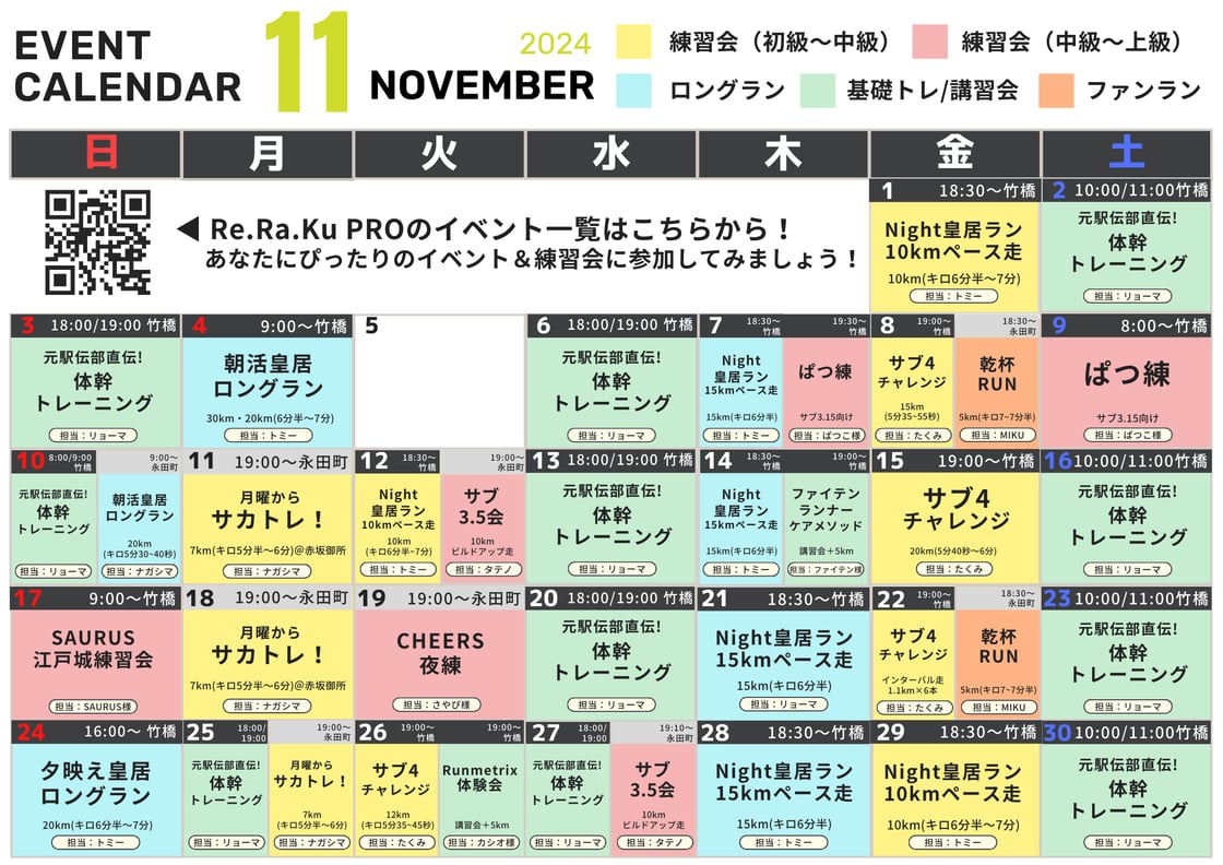 Re.Ra.Ku PROでは毎月様々なランニングイベントを開催しております。健康のために走っている方も、マラソン大会に目標をもって走っている方も、理想の自分に向けて一緒に走りませんか!? 11月のイベント一覧サイトhttps://lit.link/rerakupro ==================================《PICK UPイベント》■竹橋皇居前店①元駅伝部直伝!体感トレーニング②サブ4チャレンジ練習会③10km・15kmペース走④朝活皇居ロングラン ■永田町店①乾杯RUN♪②月曜から"サカトレ" 〜尻筋を鍛えよう〜③サブ3.5練習会 ================================== 皆様のご参加、心よりお待ちしております♪Re.Ra.Ku PRO