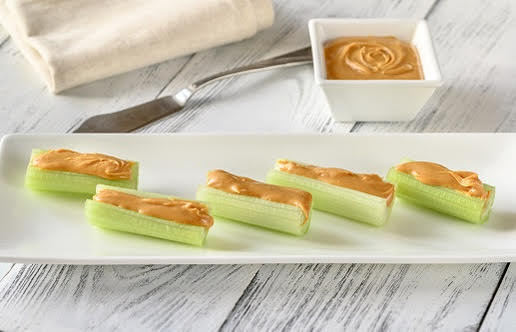 セロリをスティック状に切って、ピーナッツバターを塗って食べると美味しくてヘルシースナックになります。