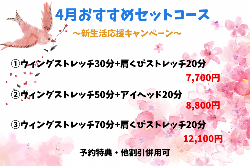 また、デスクワークで首や肩が疲れている方、立ちっぱなしや動きっぱなしで足腰が疲れている方、当店では新生活を頑張る皆さまに合ったキャンペーンコースがございます!