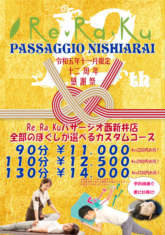 10/13(月) 3連休最終日に心も体もリラックスしませんか?【Re.Ra.Ku パサージオ西新井店】