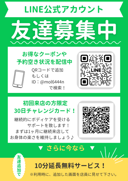 一つがお友達追加後すぐに使うことが出来る「施術10分延長無料クーポン」をプレゼント★