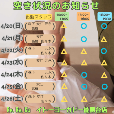 こんにちはRe.Ra.Kuイトーヨーカドー能見台店です!朝晩だいぶ涼しくなりましたね!ずっと暑かったため夏はシャワーで済ませてしまっていた方が多いと思います。(私もです)理想は湯船に浸かる習慣があると良いと思います。湯船に浸かると血行促進などにも効果が期待できます!長く浸からなくてもいいので今からでもチャレンジしてみてください♪【本日の空き状況】1名様 14:20~20:00以上がご案内可能になっております♪その他ご希望がございましたらお気軽にお電話でお問い合わせください。 今日も能見台店のブログをお読みいただいてありがとうございます。皆様のご来店を心よりお待ちしております。Re.Ra.Kuイトーヨーカドー能見台店 お店の口コミも募集しております♪こちらをタッチ