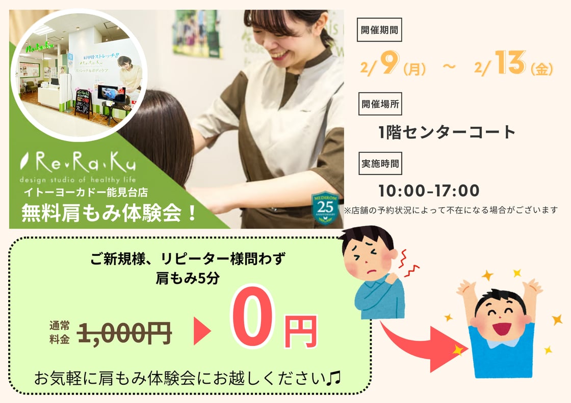 こんにちはRe.Ra.Kuイトーヨーカドー能見台店です!今週の空き状況(2月9日~2月15日)2月9日(月)肩もみ体験13:00 ~ 15:0015:30 ~ 20:002月10日(火)肩もみ体験10:00 ~ 20:002月11日(水)肩もみ体験・建国記念日10:00 ~ 18:302月12日(木)肩もみ体験10:00 ~ 60分コース12:30 ~ 20:002月13日(金)肩もみ体験10:00 ~ 20:002月14日(土)バレンタインデー10:00 ~ 19:002月15日(日)10:00 ~ 20:00来週9日(月)~13日(金)の期間中に「肩もみ体験会」を開催をいたします!5分でRe.Ra.Kuのスタッフがお辛い肩のコリをほぐさせていただきます。肩の凝りがお辛い方は是非リラクにお任せください♪【場所】イトーヨーカドー能見台店1階 センターコート【時間】10:00~17:00 ※店舗の予約状況によってスタッフが不在の場合がございます。ご了承くださいませ。その他ご不明点がござましたらお気軽に店頭もしくはお電話でお問い合わせください。 今日も能見台店のブログをお読みいただいてありがとうございます。皆様のご来店を心よりお待ちしております。Re.Ra.Kuイトーヨーカドー能見台店 お店の口コミも募集しております♪こちらをタッチ